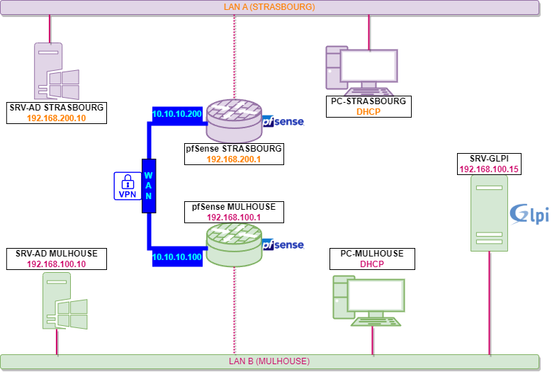 ♦ Les deux sites sont interconnectés par tunnel Ipsec via les pfSense.